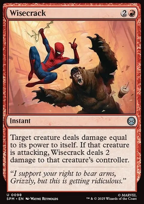 Target creature deals damage equal to its power to itself. If that creature is attacking, Wisecrack deals 2 damage to that creature's controller.