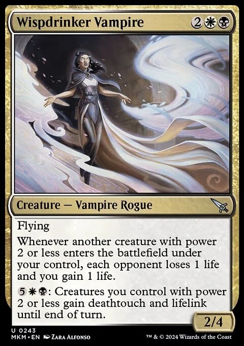 Flying Whenever another creature with power 2 or less enters the battlefield under your control, each opponent loses 1 life and you gain 1 life. {5}{W}{B}: Creatures you control with power 2 or less gain deathtouch and lifelink until end of turn.