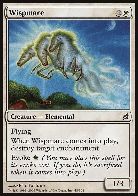 Flying When Wispmare enters, destroy target enchantment. Evoke {W} (You may cast this spell for its evoke cost. If you do, it's sacrificed when it enters.)
