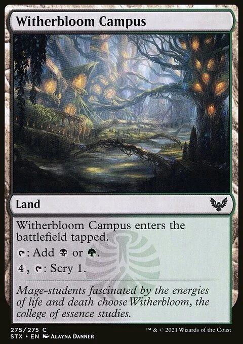Witherbloom Campus enters the battlefield tapped. {T}: Add {B} or {G}. {4}, {T}: Scry 1.