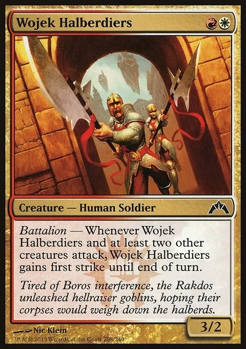 Battalion — Whenever Wojek Halberdiers and at least two other creatures attack, Wojek Halberdiers gains first strike until end of turn.