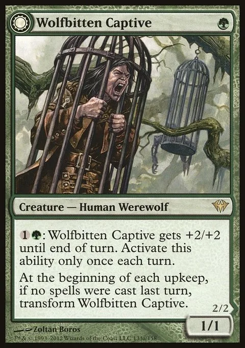At the beginning of each upkeep, if no spells were cast last turn, transform Wolfbitten Captive.