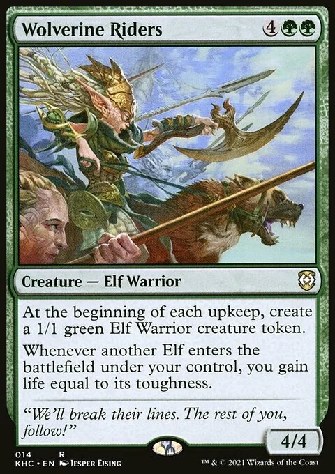 At the beginning of each upkeep, create a 1/1 green Elf Warrior creature token. Whenever another Elf you control enters, you gain life equal to its toughness.
