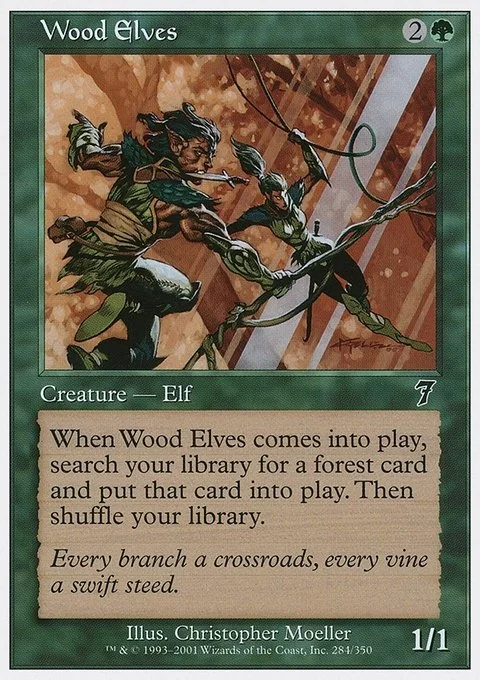 When Wood Elves enters the battlefield, search your library for a Forest card, put that card onto the battlefield, then shuffle.