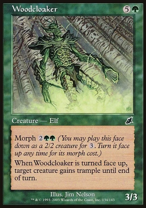 Morph {2}{G}{G} (You may cast this card face down as a 2/2 creature for {3}. Turn it face up any time for its morph cost.) When Woodcloaker is turned face up, target creature gains trample until end of turn.