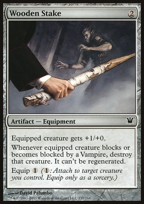 Equipped creature gets +1/+0. Whenever equipped creature blocks or becomes blocked by a Vampire, destroy that creature. It can't be regenerated. Equip {1} ({1}: Attach to target creature you control. Equip only as a sorcery.)