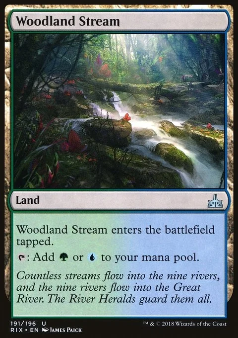 Woodland Stream enters the battlefield tapped. {T}: Add {G} or {U}.
