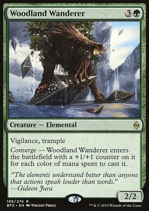Vigilance, trample Converge — Woodland Wanderer enters the battlefield with a +1/+1 counter on it for each color of mana spent to cast it.