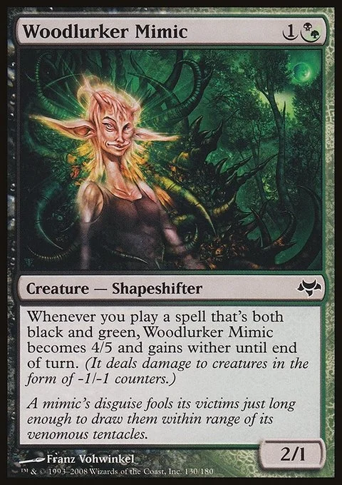 Whenever you cast a spell that's both black and green, Woodlurker Mimic has base power and toughness 4/5 until end of turn and gains wither until end of turn. (It deals damage to creatures in the form of -1/-1 counters.)