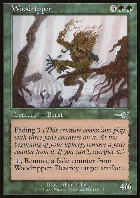 Fading 3 (This creature enters the battlefield with three fade counters on it. At the beginning of your upkeep, remove a fade counter from it. If you can't, sacrifice it.) {1}, Remove a fade counter from Woodripper: Destroy target artifact.