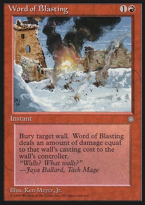 Bury target wall. Word of Blasting deals an amount of damage equal to that wall’s casting cost to the wall’s controller.
