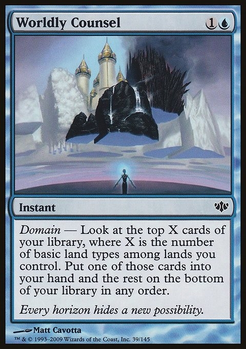 Domain — Look at the top X cards of your library, where X is the number of basic land types among lands you control. Put one of those cards into your hand and the rest on the bottom of your library in any order.