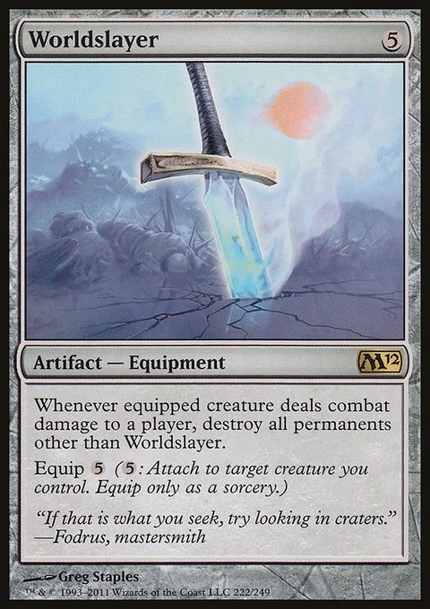 Whenever equipped creature deals combat damage to a player, destroy all permanents other than Worldslayer. Equip {5} ({5}: Attach to target creature you control. Equip only as a sorcery.)