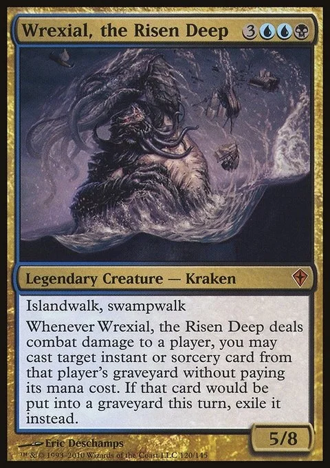 Whenever Wrexial, the Risen Deep deals combat damage to a player, you may cast target instant or sorcery card from that player's graveyard without paying its mana cost. If that card would be put into a graveyard this turn, exile it instead.