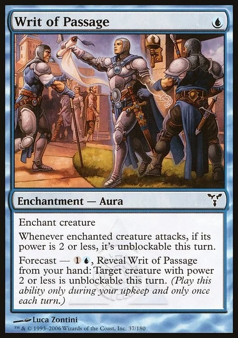 Forecast — {1}{U}, Reveal Writ of Passage from your hand: Target creature with power 2 or less can't be blocked this turn. (Activate only during your upkeep and only once each turn.)