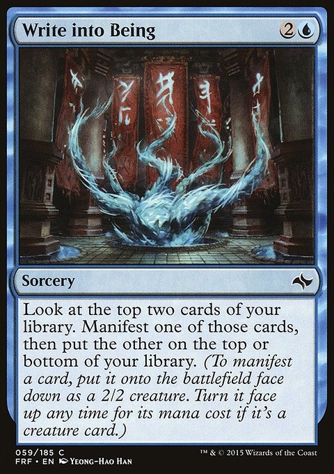 Look at the top two cards of your library. Manifest one of those cards, then put the other on the top or bottom of your library. (To manifest a card, put it onto the battlefield face down as a 2/2 creature. Turn it face up any time for its mana cost if it's a creature card.)
