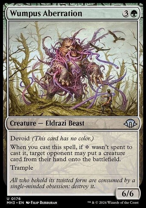 Devoid (This card has no color.) When you cast this spell, if {C} wasn't spent to cast it, target opponent may put a creature card from their hand onto the battlefield. Trample