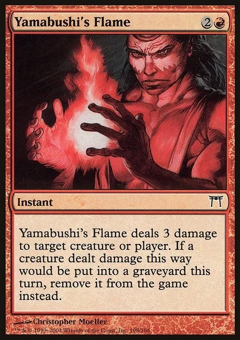 Yamabushi's Flame deals 3 damage to any target. If a creature dealt damage this way would die this turn, exile it instead.