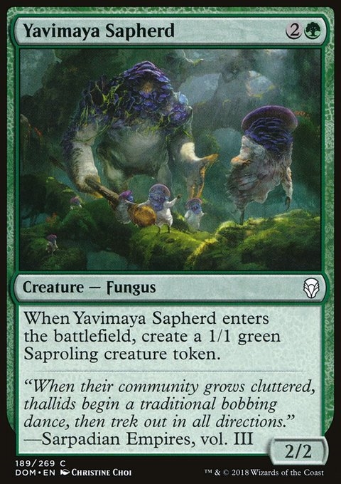When Yavimaya Sapherd enters the battlefield, create a 1/1 green Saproling creature token.