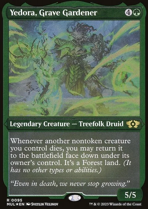 Whenever another nontoken creature you control dies, you may return it to the battlefield face down under its owner's control. It's a Forest land. (It has no other types or abilities.)