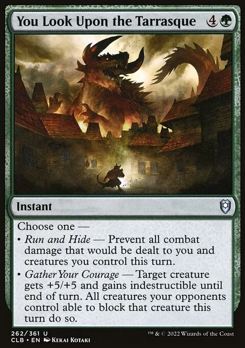 Choose one — • Run and Hide — Prevent all combat damage that would be dealt to you and creatures you control this turn. • Gather Your Courage — Target creature gets +5/+5 and gains indestructible until end of turn. All creatures your opponents control able to block that creature this turn do so.