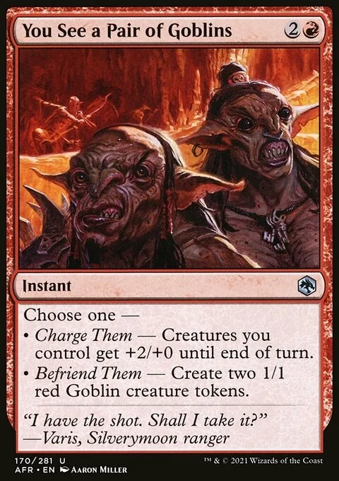 Choose one — • Charge Them — Creatures you control get +2/+0 until end of turn. • Befriend Them — Create two 1/1 red Goblin creature tokens.