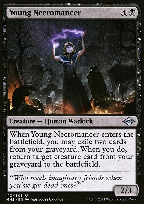 When Young Necromancer enters the battlefield, you may exile two cards from your graveyard. When you do, return target creature card from your graveyard to the battlefield.