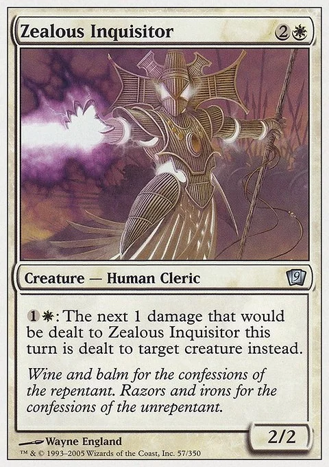 1W: The next 1 damage that would be dealt to Zealous Inquisitor this turn is dealt to target creature instead.