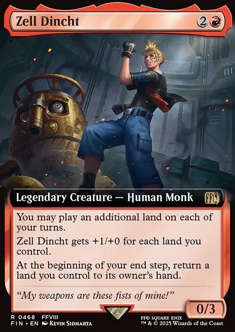 You may play an additional land on each of your turns. Zell Dincht gets +1/+0 for each land you control. At the beginning of your end step, return a land you control to its owner's hand.