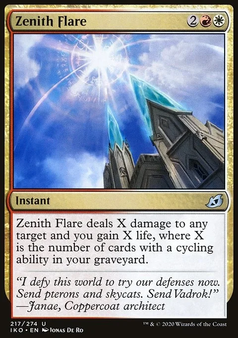Zenith Flare deals X damage to any target and you gain X life, where X is the number of cards with a cycling ability in your graveyard.