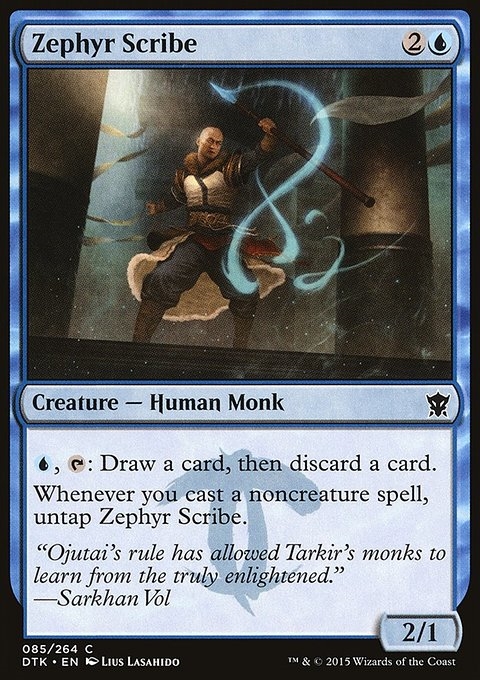 {U}, {T}: Draw a card, then discard a card. Whenever you cast a noncreature spell, untap Zephyr Scribe.