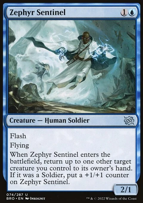 Flash Flying When Zephyr Sentinel enters the battlefield, return up to one other target creature you control to its owner's hand. If it was a Soldier, put a +1/+1 counter on Zephyr Sentinel.