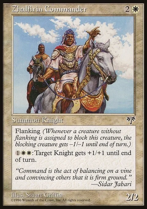 Flanking (Whenever a creature without flanking is assigned to block this creature, the blocking creature gets -1/-1 until end of turn.) 1WW: Target Knight gets +1/+1 until end of turn.