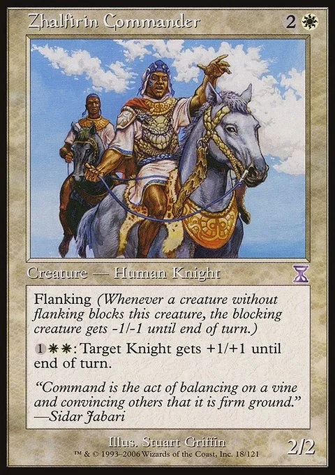 Flanking (Whenever a creature without flanking blocks this creature, the blocking creature gets -1/-1 until end of turn.) {1}{W}{W}: Target Knight creature gets +1/+1 until end of turn.