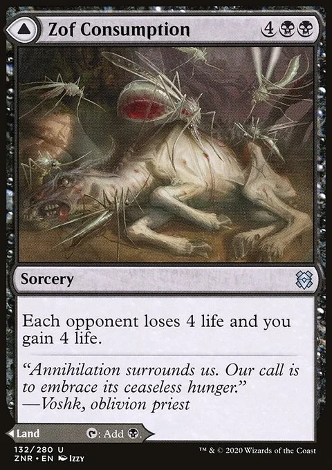 Zof Consumption Each opponent loses 4 life and you gain 4 life. Zof Bloodbog Zof Bloodbog enters the battlefield tapped. {T}: Add {B}.