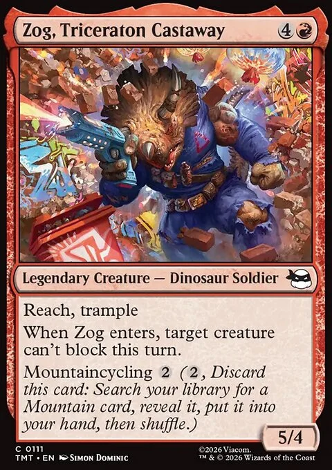 Reach, trample When Zog enters, target creature can't block this turn. Mountaincycling {2} ({2}, Discard this card: Search your library for a Mountain card, reveal it, put it into your hand, then shuffle.)