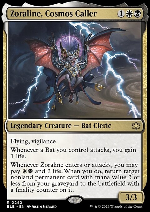 Whenever Zoraline enters or attacks, you may pay {W}{B} and 2 life. When you do, return target nonland permanent card with mana value 3 or less from your graveyard to the battlefield with a finality counter on it.