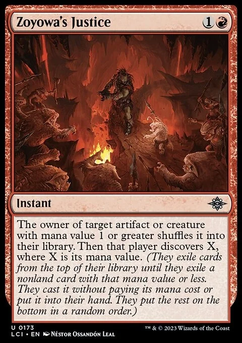 The owner of target artifact or creature with mana value 1 or greater shuffles it into their library. Then that player discovers X, where X is its mana value. (They exile cards from the top of their library until they exile a nonland card with that mana value or less. They cast it without paying its mana cost or put it into their hand. They put the rest on the bottom in a random order.)
